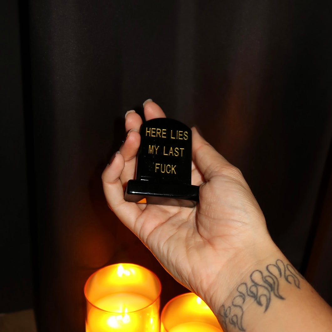 For the unapologetic souls who have officially run out of patience for bullshit. This cheeky little gravestone, carved from powerful Black Obsidian, is the ultimate statement piece for your altar, desk, or nightstand.